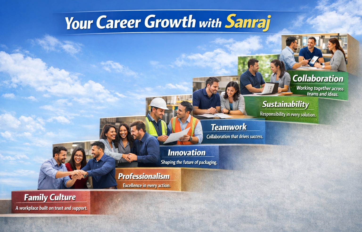 Careers at Sanraj grow step by step, supported by values that define our culture. Every step represents a part of the journey toward success.